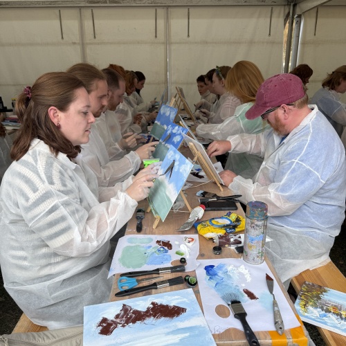 Malen im Bob-Ross-Stil erfolgt mit Ölfarbe. Öl ist ein wunderschönes Material, lässt sich aber nur schwer von Kleidung entfernen. Daher wird den Teilnehmern des Bob-Ross-Workshops empfohlen, alte Kleidung zu tragen. Bei Bedarf verwenden wir außerdem eine Einwegjacke mit langen Ärmeln und Handschuhe.